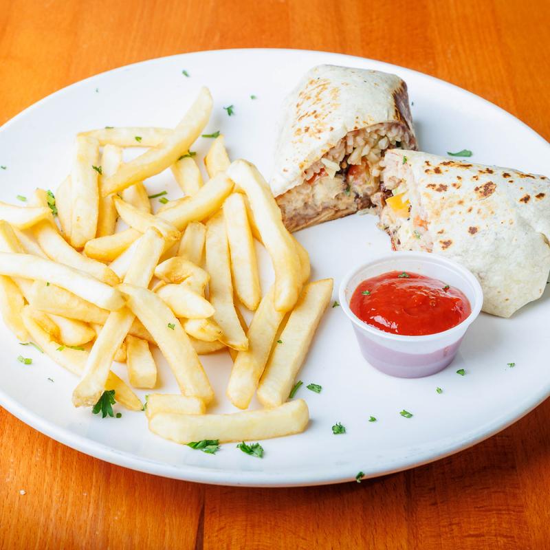 Asada - pollo con arroz, frijol, queso, pico de gallo o salsa verde.