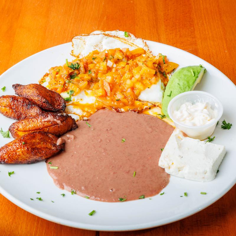 Huevos rancheros con platano, frijoles, queso, aguacate y crema.
