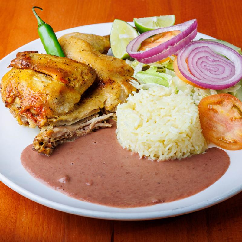 Medio pollo al horno con arroz frijoles y ensalada. Half baked chicken with rice, beans & salad.
