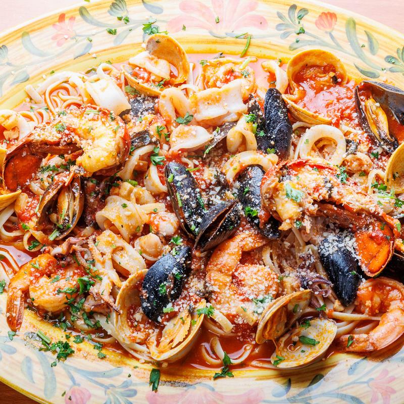 Mussels, shrimp, calamari, clams, and crab legs, served over linguine with marinara sauce.