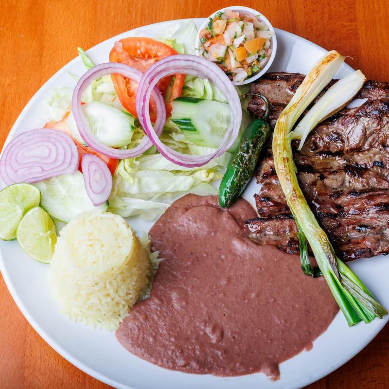Grilled steak. Skirt steak with rice, beans, avocado, salad & pico de gallo.